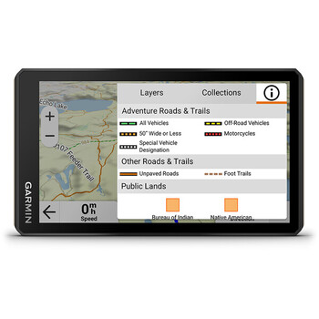- Navigation sur pistes et virage-à-virage permettant d'explorer des routes non asphaltées, des sentiers et des pistes de motoneige avec les cartes Adventure Roads and Trails.